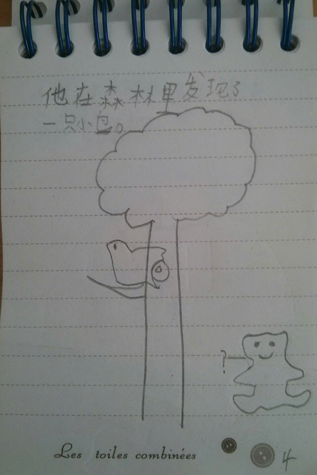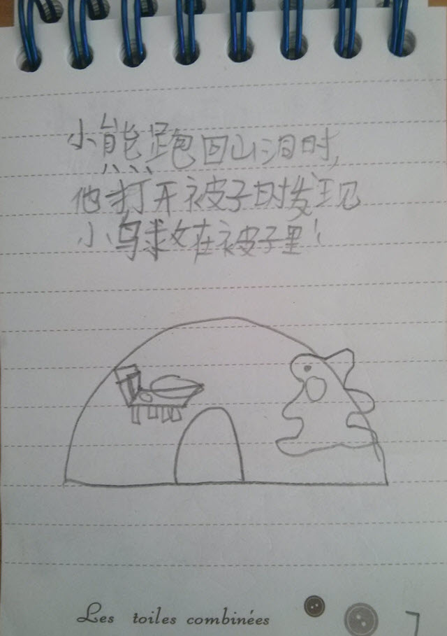 小杨儿童绘本:小熊和小鸟 发表于 2020-05-10 分类于 其他第四 阅读次数: Disqus: 本文字数: 163 阅读时长 ≈ 1 分钟 这是刚来美国时,小杨同志在小学二年级创作的非著名儿童绘本:小熊和小鸟。该绘本情节乏味(还有若干错别字),画工粗糙——然而,这都无法阻止我将其拍照保存,汇编成册。当时,“小熊在被子里发现小鸟”这一页让我印象深刻,想想看你回到家,刚一掀开被子——好家伙,居然有只鸟!除此之外,都是一个父亲敝帚自珍的情结在作怪。 以下为九页绘本手稿: 本文作者: 老杨 本文链接: https://www.oldyoungboy.com/Little-Bear-and-Little-Bird-by-Tom-Yang/ 版权声明: 本博客所有文章除特别声明外,均采用 BY-NC-SA 许可协议。转载请注明出处!